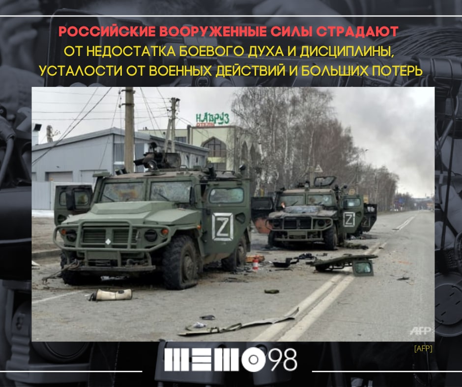 Согласно данным британской разведки, российские вооруженные силы, задействованные в специальной военной операции в Украине, страдают от недостатка боевого духа и дисциплины, усталости от военных действий и больших потерь. Российское командование не смогло удовлетворить базовые потребности военнослужащих, дислоцированных в Украине, включая соответствующую униформу, вооружение и пайки, а также зарплату. Это почти наверняка способствовало низкому боевому духу большей части военнослужащих, утверждает Министерство обороны Великобритании.