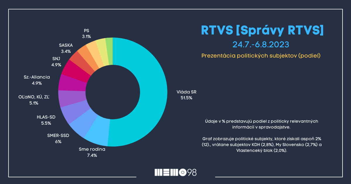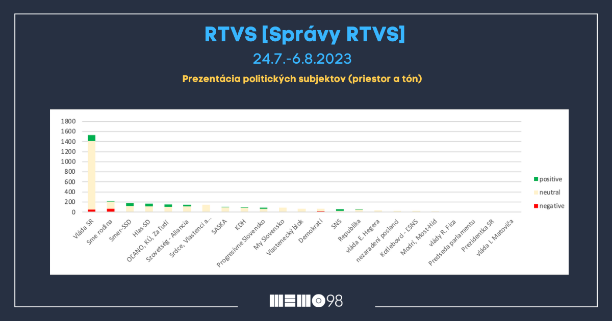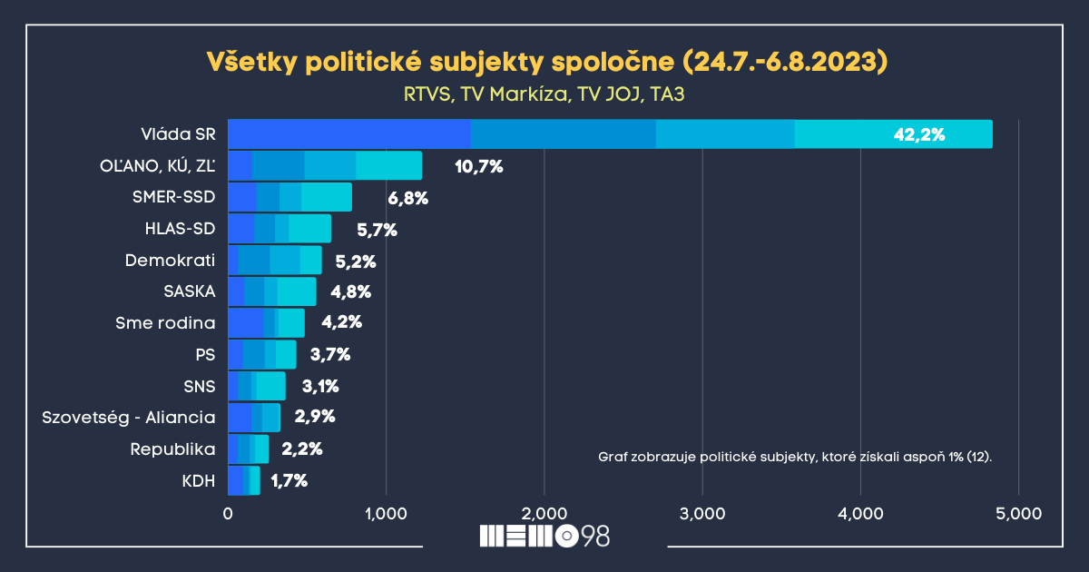 V televíziách najviac priestoru zo všetkých politických subjektov (politické strany, vláda a jednotlivé ministerstvá, prezidentka, predseda NR SR, Štátna komisia pre voľby) získala vláda - v priemere všetkých televízií to bolo 42,2 (v prvom období, na konci júna, to bolo 27,1%).