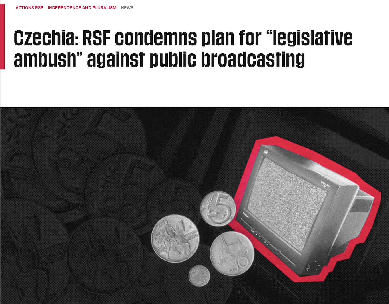 Vo vyhlásení medzinárodnej orgánizácie zaoberajúcej sa slobodou tlače (Reporters Without Borders / Reporters Sans Frontiers - RSF) sa mimo iného píše, že Česká televízia (ČT) a Český rozhlas (ČRo) sú pod hrozbou straty nezávislosti v dôsledku plánu českej vlády zrušiť koncesionárske poplatky. Správa prichádza v rovnakom týždni, kedy český minister kultúry Oto Klempíř (strana Motoristé sobě) po stretnutí s riaditeľmi ČT a ČRo vyhlásil, že zlúčenie ČT a ČRo sa nechystá, no potvrdil, že model financovania cez pravidelné mesačné poplatky nahradí model financovania zo štátneho rozpočtu.