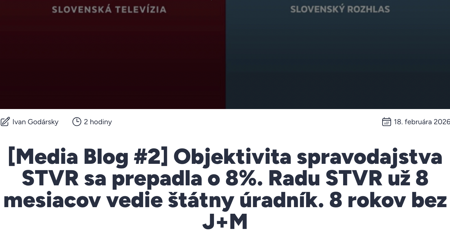 [Kontext a pohľad MEMO 98]: Radu STVR už 9 mesiacov (od júla 2025) vedie z pozície podpredsedu Lukáš Machala, štátny úradník Ministerstva kultúry. Rada nezvolením predsedu (pôvodný predseda, Jozef Krošlák, ktorý bol za predsedu Rady zvolený v apríli 2025 skonal začiatkom júla), od zasadnutia na konci júla (29.7.2025) porušuje vlastný Rokovací poriadok - už na 11 zasadnutiach. O kreovaní a rokovaniach Rady STVR sme podrobnejšie písali aj va našich blogoch (#1 z júl 2025, #2 z februára 2026).